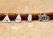 TRIANGLE, DROP, CHAMSA AND FISH SILVER PENDANTS. |