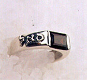 Anel em prata com as letras em relevo e granada. CLIQUE NA FOTO E VEJA EM OURO./